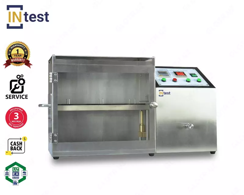 Параметр Значение Временной диапазон 0–999,9 с Разрешение по времени 0,01 с Время зажигания 15 с Приспособление для образцов U-образная форма, внутренний размер: 330 × 50 мм Размер образца 356 × 100 мм, толщина менее 13 мм Угол горелки Вертикальный Внутренний диаметр головки горелки 9,5 мм Высота воспламенения 19 мм (от верхней части горелки до образца) Высота пламени 38 мм ± 2 мм Электропитание 220 В переменного тока, 50/60 Гц Габаритные размеры (Д × Ш × В) 450 × 310 × 510 мм Вес 30 кг
