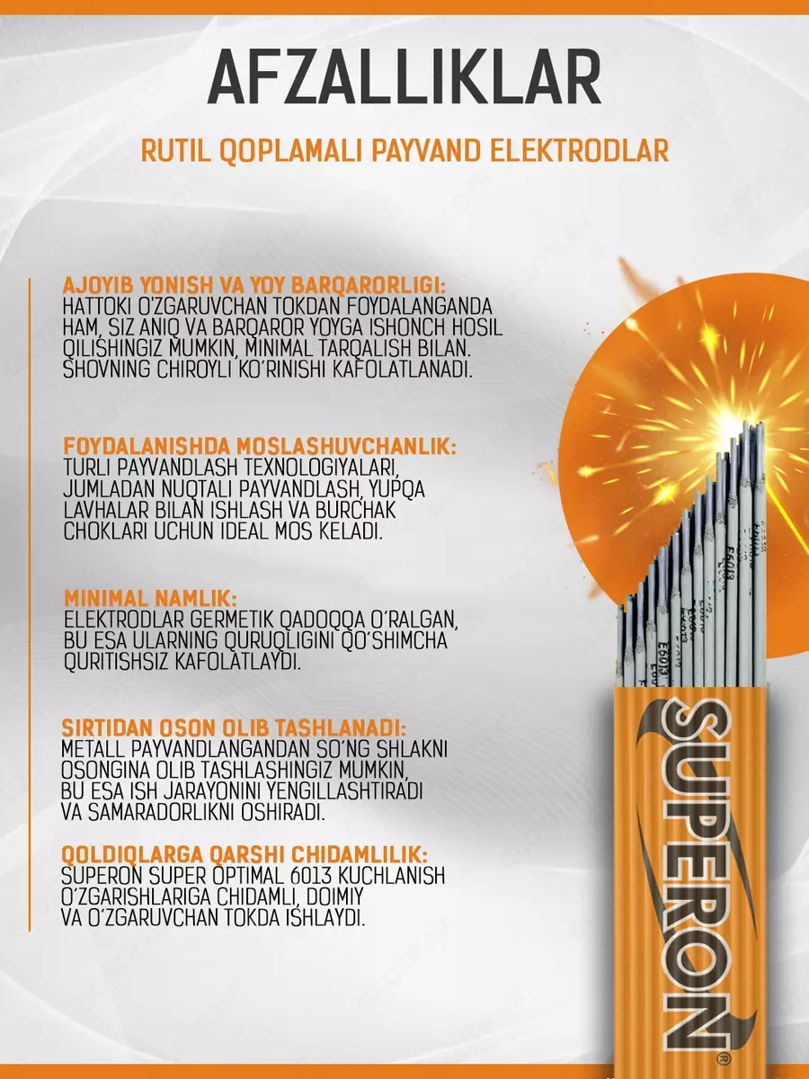 Payvandlash elektrodlari SUPERON Super optimal 6013: uglerodli va past qotishma po'lat uchun MP-3 sinfidagi yuqori sifatli rutil elektrodlari. Barqaror payvandlash, minimal bo'shliq, cürufni oson olib tashlash.