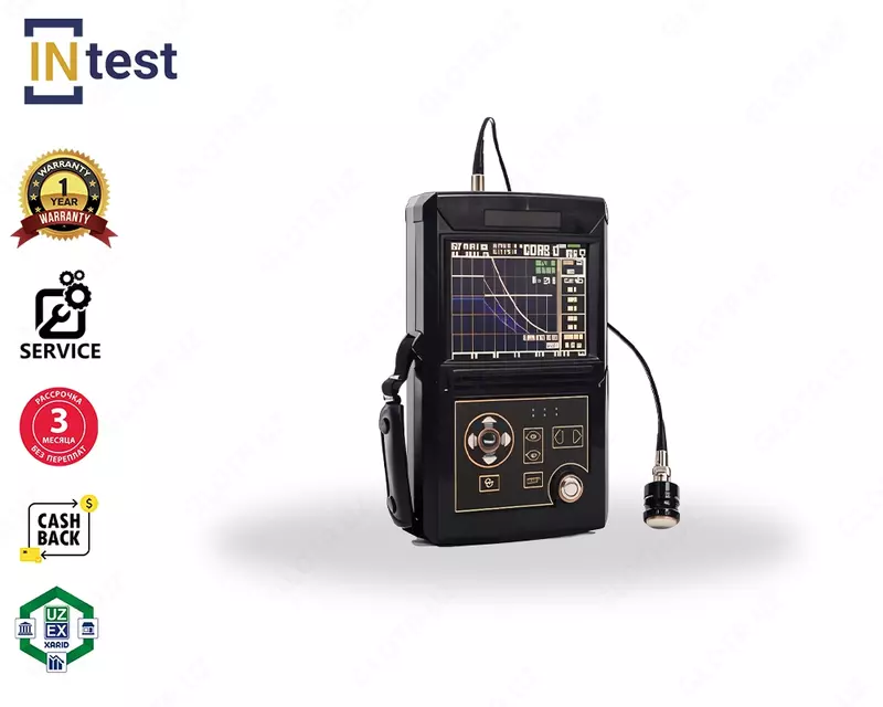 Parametr Qiymati Ishchi chastota 0.5 MHz ~ 15 MHz Skanerlash diapazoni 0–6000 mm Vertikal chiziqlilik xatosi ≤ 4% Gorizontal chiziqlilik xatosi ≤ 0.1% Dinamik diapazon ≥ 32 dB Shovqin darajasi < 8% Tezlik diapazoni 1000 ~ 9999 m/s Sinov sezgirligi ≥ 60 dB (200 mm chuqurlikda, tekis tubli teshik Φ2) Kuchaytirish diapazoni 0 ~ 110 dB Standart o‘zgartirgichlar (zondlar) To‘g‘ri zond: 2.5 MHz, ø20 mm, Q9–Q9 kabelBurchakli zond: 4 MHz, 60°, 8×9 mm, Q9–C5 kabel Kutish rejimida ish vaqti ≥ 10 soat uzluksiz ishlash Ishlash harorati –20 ~ 70 °C Nisbiy namlik 20 ~ 95% RH Gabaritlar 240 × 160 × 40 mm Og‘irligi 1.2 kg Standart komplekt Asosiy blok, to‘g‘ri zond, burchakli zond, quvvat adapteri, BNC kabellari, PK uchun dasturiy ta’minot, qo‘llanma, sertifikat, kafolat taloni Qo‘shimcha aksessuarlar Qo‘shimcha zondlar, kabellar, kalibrlash bloklari, kontakt suyuqligi